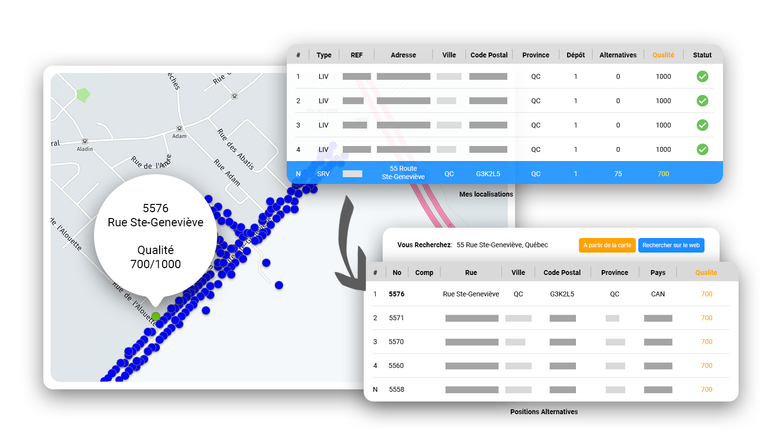 Logix2Go TMS vous propose des outils de géolocalisation à la fine pointe de la technologie. Automatisez sans erreurs jusqu'à 95% de votre correction d'adresse avec une qualité irréprochable. Oui ! il est possible d'offrir une livraison précise même au fond de la campagne. Nos banques d'adresses multi-sources sont même au courant de la plupart des nouvelles constructions !